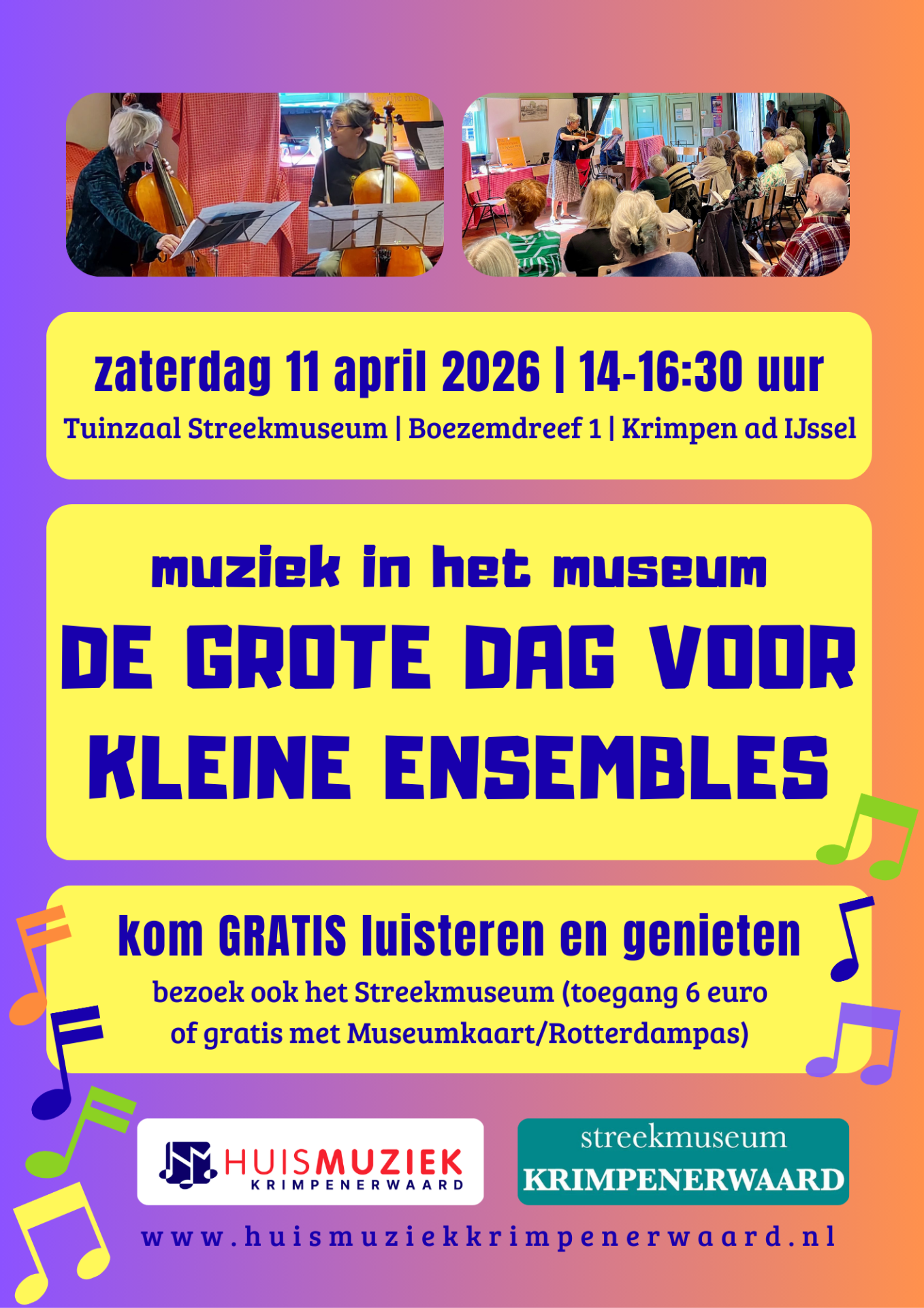 Zaterdagmiddag 11 april (14 tot 16:30 uur) bruist de Tuinzaal van het Streekmuseum Krimpenerwaard van de muziek. Voor de twaalfde keer organiseren we De grote dag voor kleine ensembles: een podium voor amateur-ensembles uit de regio. Het belooft een zeer gevarieerd programma te worden met klassieke muziek, traditionele muziek, muziek uit andere werelddelen; en ook een zeer divers gezelschap aan musici en instrumenten. U bent van harte welkom om te komen luisteren en genieten, de toegang is gratis.