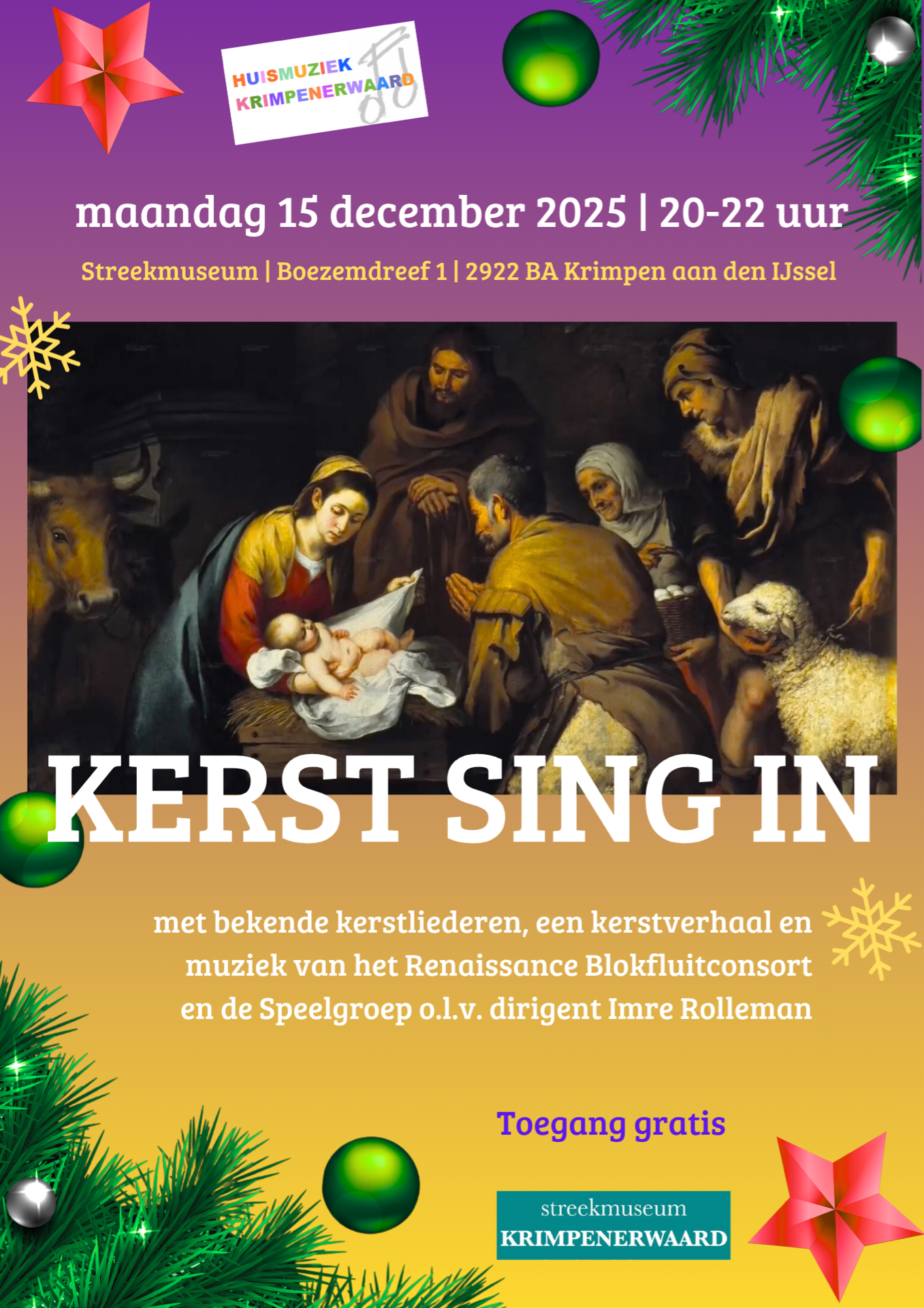 Meezingen met bekende kerstliederen, luisten naar een kerstverhaal en mooie muziek. Net voor de kerstperiode losbarst brengt Huismuziek in samenwerking met het Streekmuseum u alvast in de kerstsfeer. In de sfeervolle Tuinzaal van het Streekmuseum zorgen het Renaissance Blokfluitconsort en de Speelgroep onder leiding van dirigent Imre Rolleman voor de muzikale omlijsting.